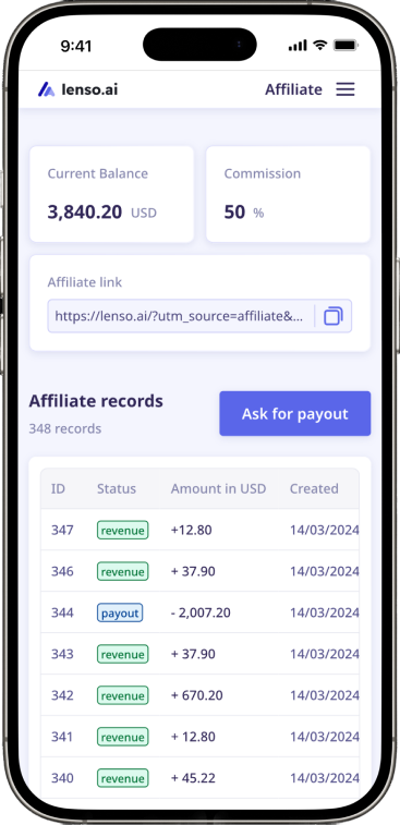 加入 lenso.ai 联盟计划,通过购买获得佣金